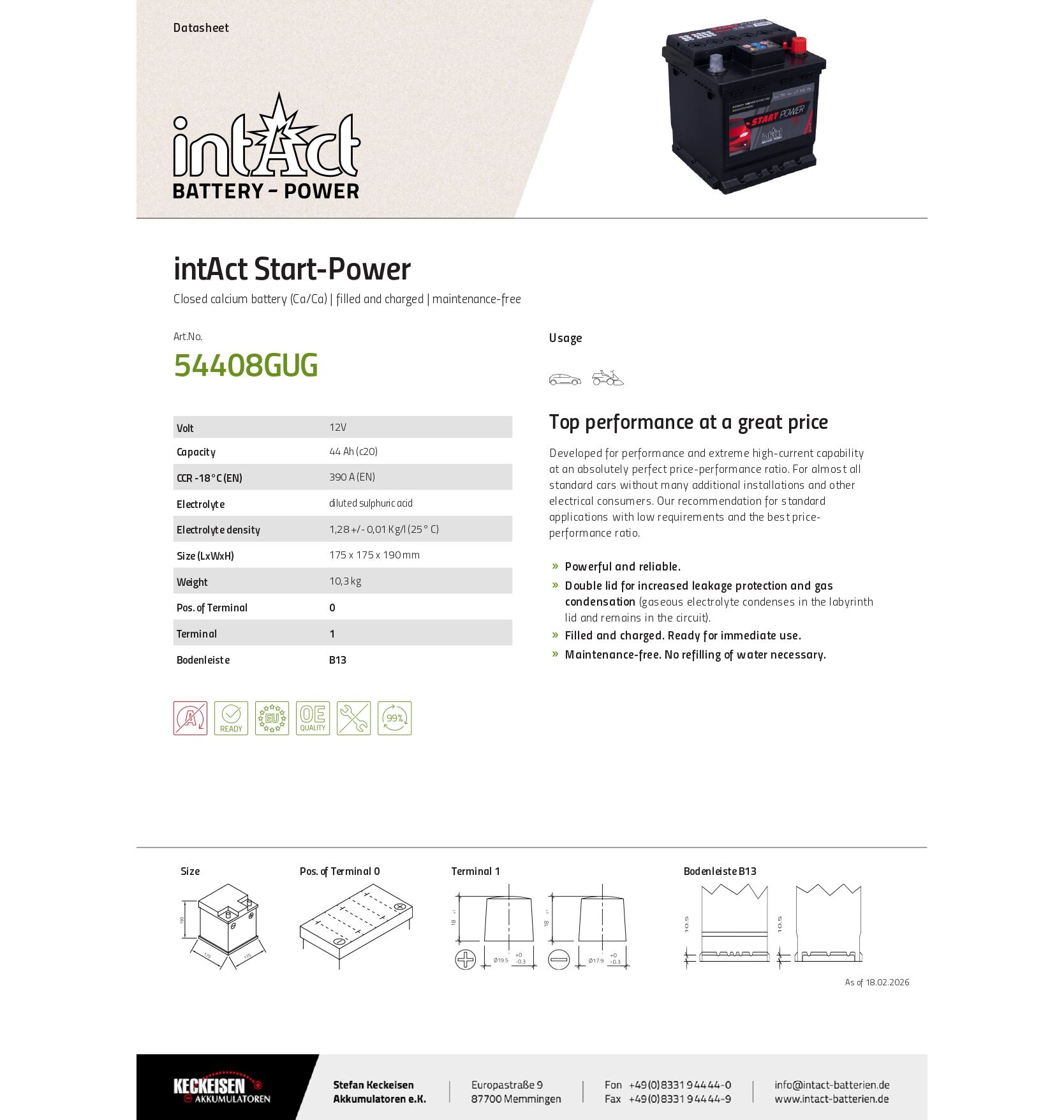 Μπαταρία αυτοκινήτου 44ah για FIAT CEICENTO, FIAT PUNTO, FIAT 500, LANCIA YPSILON. Αντιστοιχία σε EXIDE CLASSIC EC400. Δύο χρόνια εγγύηση. Ερμητικά κλειστού τύπου με μηδέν συντήρηση. 30% περισσότερα αμπέρ εκκίνησης από άλλες μάρκες. Με εξαιρετική απόδοση και σε οχήματα με Diesel κινητήρες.