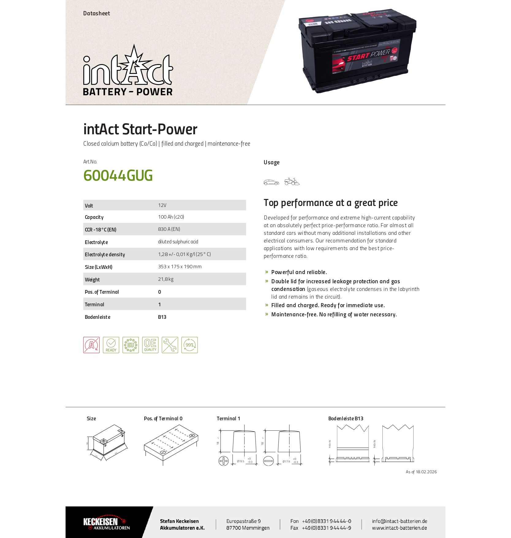 Μπαταρία Αυτοκινήτου, Φορτηγού, Jeep, Τροχόσπιτου, Taxi, Γεννητριών INTACT START POWER 60044 100 830A | battery-expert.gr