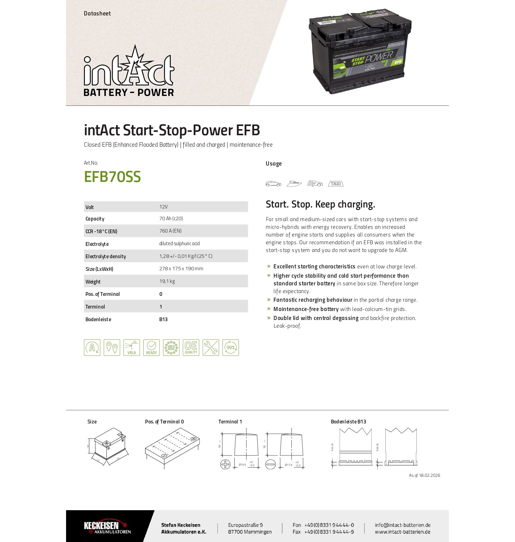 Μπαταρία αυτοκινήτου INTACT Start-Stop EFB70SS 70AH 760A κατσκευασμένη με τα υψολότερα γερμανικά στάνταρ. Ιδανικές για τεχνολογίες οχημάτων start-stop και για οχήματα με ενεργειακές ανάγκες άνω του μέσου, είτε αυτό σημαίνει ένα πιο απαιτητικό πρόγραμμα οδήγησης είτε εγκατεστημένο πρόσθετο εξοπλισμό. Υποστήριξη για ένα μεγάλο αριθμό εκκινήσεων και μακρών περιόδων χωρίς λειτουργία μηχανής. Δείτε και το Video στο YouTube